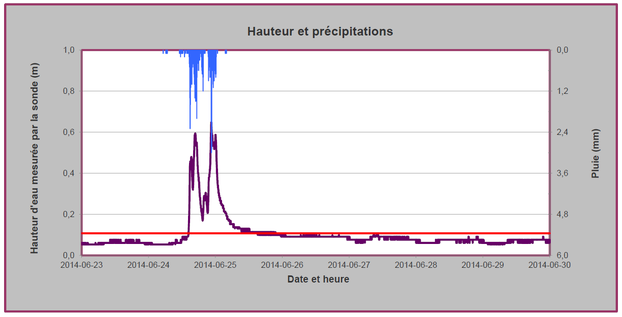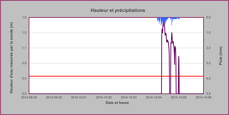 Le premier graphique présente la hauteur du niveau d’eau dans la surverse en corrélation avec l’information de pluie collectée via un pluviomètre régional. La ligne en rouge présente le seuil de débordement.